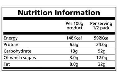 One serving = half the pack (400g) therefore each serving provides 52g carbohydrate