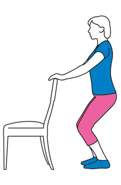 Place a chair behind you for safety or hold onto a chair in front of you. While standing with feet shoulder width apart and in front of a stable support for balance, bend your knees and stick your buttocks out (as if going to sit down).