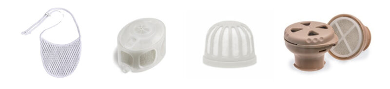 The bibs can be handwashed. The HME devices are single use and should not be washed; if they are saturated, they need to be thrown out and replaced. You will have been given these on the ward; some examples are pictured below: